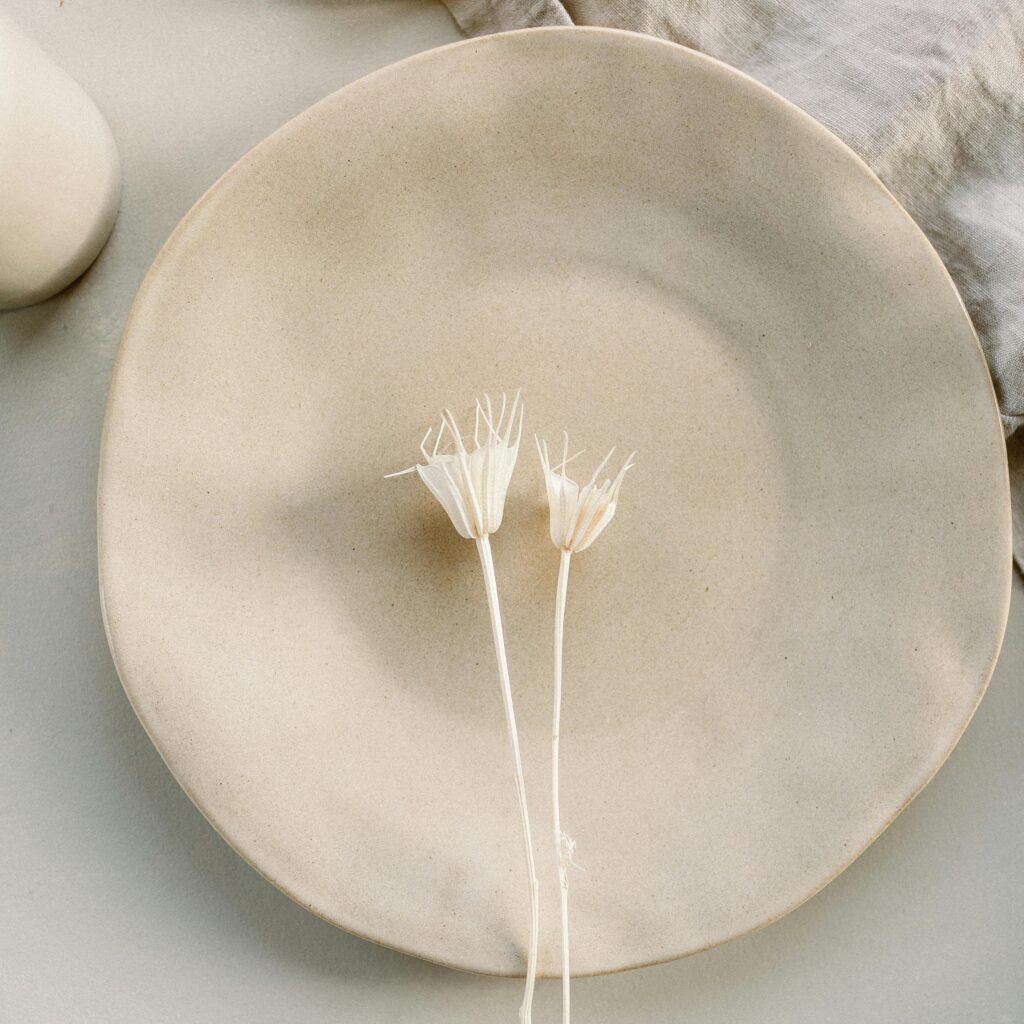 Werk met linnen servetten, keramieken borden in zand- en natureltinten