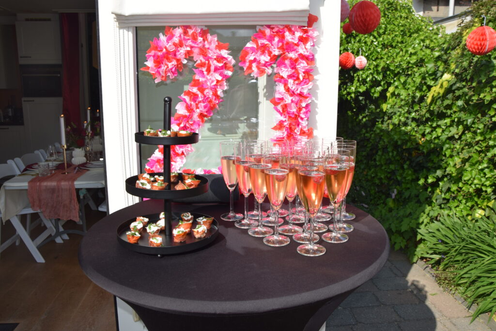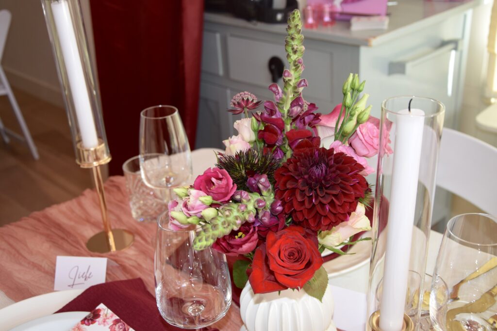 Het thema ‘Bordeaux & Roze’ draait om warmte, romantiek en stijl. Denk aan diepe rode tinten gecombineerd met zachtroze servetten, bloemstukken en kleding. De tafeldecoratie was afgestemd op dit kleurenpalet en zorgde voor een elegante, samenhangende uitstraling.